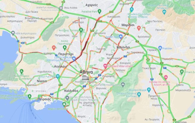 Στο «κόκκινο» βρίσκεται και η έξοδος της Εθνικής Οδού Αθηνών – Κορίνθου όπως και της Αθηνών – Λαμίας, από Ροσινιόλ μέχρι Αχαρνών.