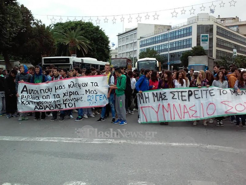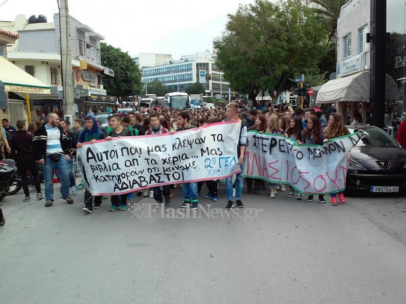 “Μην μας στερείτε το μέλλον” και “Αυτοί που μας έκλεψαν τα βιβλία από τα χέρια, μας κατηγορούν ότι μείναμε αδιάβαστοι” είναι μερικά από τα συνθήματα στα πανό μαθητών που συμμετέχουν στις κινητοποιήσεις στα Χανιά, ενώ καταλήψεις και συλλαλητήρια μαθητών είναι σε εξέλιξη σε όλους τους νομούς της Κρήτης.