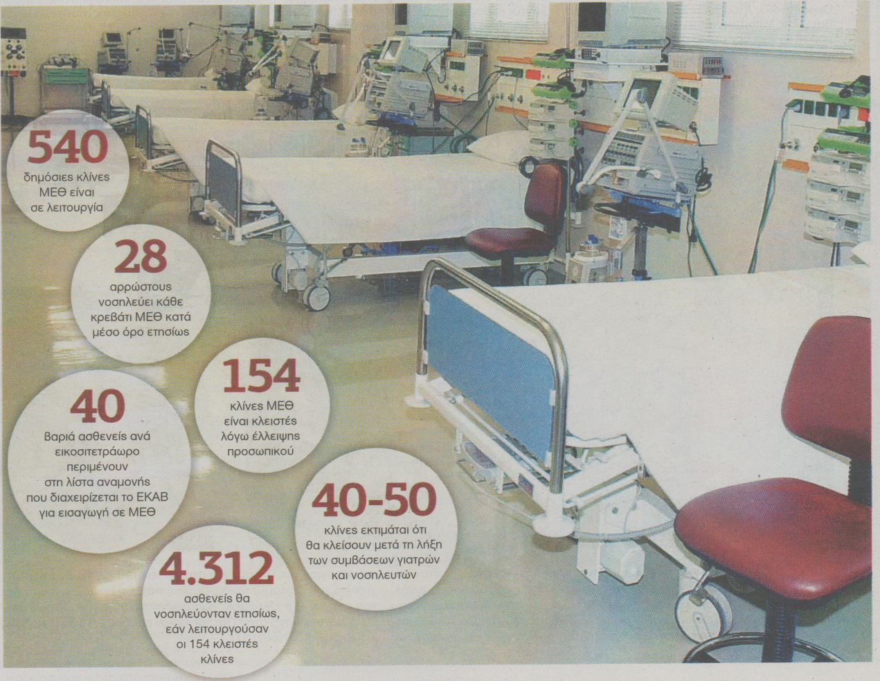 Ερμητικά κλειστές παραμένουν 154 Μονάδες Εντατικής Θεραπείας της χώρας, την ώρα που η λίστα αναμονής που διαχειρίζεται το ΕΚΑΒ αριθμεί καθημερινά έως και 40 βαριά ασθενείς. Στο παρά πέντε αναζητείται λύση από το υπουργείο Υγείας, καθώς έως το τέλος Μαρτίου αναμένεται να τεθούν εκτός λειτουργίας άλλα 40-50 κρεβάτια.