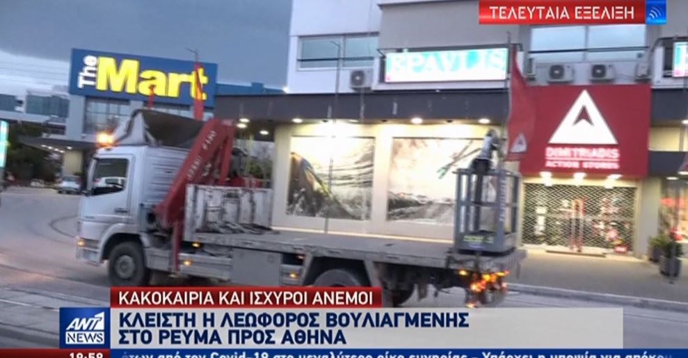 Κλειστή είναι εδώ και λίγη ώρα η λεωφόρος Βουλιαγμένης στο ρεύμα προς Αθήνα. Μια πινακίδα κρέμεται στην ταράτσα κτιρίου, καθώς ξεκόλλησε από τους ισχυρούς ανέμους και υπάρχει ο κίνδυνος να πέσει στο έδαφος. Η διακοπή της κυκλοφορίας έχει σημειωθεί από το ύψος της λεωφόρου Αλίμου μέχρι και την Εθνάρχου Μακαρίου.