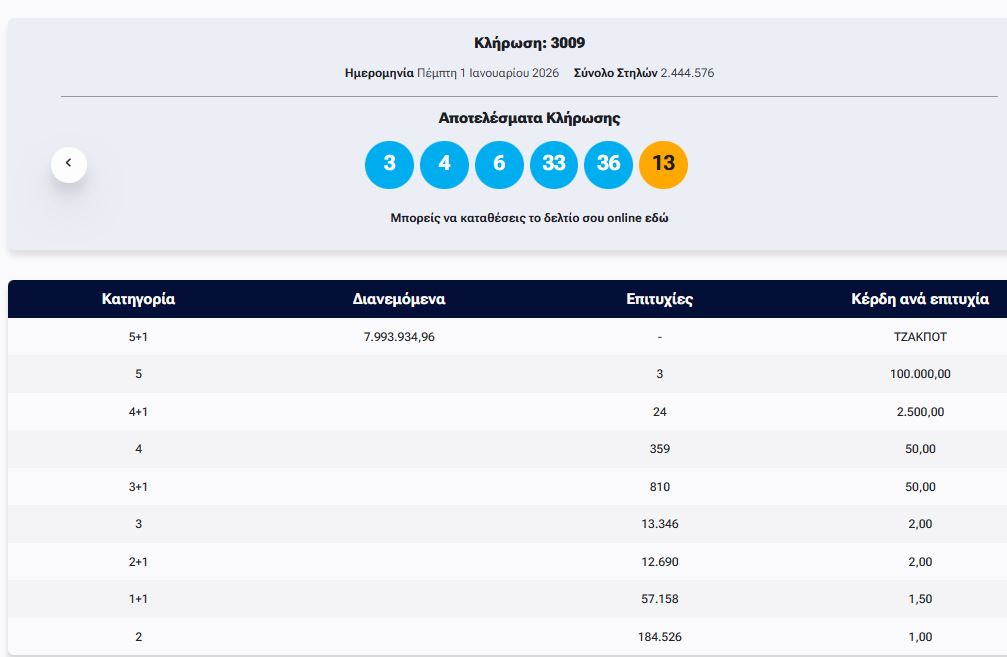 Κλήρωση ΤΖΟΚΕΡ 1/1/2026: Αυτοί είναι οι τυχεροί αριθμοί Enikos Newsroom 22:08, Πέμπτη 01 Ιανουαρίου 2026 κοινωνία Έγινε η κλήρωση με αριθμό 3009 του ΤΖΟΚΕΡ το βράδυ της Πέμπτης (1/1). 18+ επίγειο, 21+ ψηφιακό | Αρμόδιος Ρυθμιστής ΕΕΕΠ | Κίνδυνος εθισμού & απώλειας περιουσίας | ΓΡΑΜΜΗ ΣΤΗΡΙΞΗΣ 1114 | Παίξε Υπεύθυνα. Η ΚΛΗΡΩΣΗ ΤΟΥ ΤΖΟΚΕΡ ΤΖΟΚΕΡ Μοιράσου το: σχολίασε κι εσύ (0 σχόλια) Ακολουθήστε το enikos.gr στο Google News και μάθετε πρώτοι όλες τις ειδήσεις Δείτε όλες τις τελευταίες ειδήσεις από την Ελλάδα και τον Κόσμο στο enikos.gr Ειδήσεις Ροή Ειδήσεων 2 ώρες πριν Ελβετία: Σοκ και δυσπιστία για την φωτιά στο μπαρ που μετέτρεψε σε τραγωδία το πρωτοχρονιάτικο πάρτι – Τα βεγγαλικά στις σαμπάνιες και τα εύφλεκτα υλικά στην οροφή 3 ώρες πριν Συγκλονίζει η μαρτυρία Ελληνίδας για την τραγωδία στο Κραν Μοντανά: «Είδαμε κόσμο να τρέχει, ασθενοφόρα, σειρήνες, ελικόπτερα» 1 ώρα πριν Λήμνος: Η εντυπωσιακή δορυφορική εικόνα που δείχνει το νησί 100% καλυμμένο από το χιόνι – Δείτε βίντεο και φωτογραφίες 3 ώρες πριν Η Νέα Υόρκη στην εποχή Μαμντάνι: Το στοίχημα της «ηθικής πόλης» και η κοινωνική ατζέντα του – Οι συμβολισμοί της ορκωμοσίας 2 ώρες πριν Αποφασισμένοι να σκληρύνουν την στάση τους οι αγρότες – Οι προτάσεις στο «τραπέζι» ενόψει της σύσκεψης την Κυριακή 3 ώρες πριν Εκπληκτική ανακάλυψη από ερασιτέχνες ερευνητές με ανιχνευτές μετάλλων – Βρήκαν μία σπάνια πολύχρωμη καρφίτσα 2.000 ετών 4 ώρες πριν Ύπνος: Κάθε πότε πρέπει να αλλάζετε σεντόνια για να προστατεύσετε την υγεία σας, σύμφωνα με ειδικό 5 ώρες πριν Η αριθμολογία «μίλησε» – Τι προβλέπεται για κάθε ημερομηνία γέννησης το 2026 6 ώρες πριν Ξεσκόνισμα: Το απρόσμενο υλικό από την κουζίνα που θα αλλάξει τον τρόπο που καθαρίζετε το σπίτι σας 5 λεπτά πριν Ρωσία και Ουκρανία αλληλοκατηγορούνται για επιθέσεις σε αμάχους την Πρωτοχρονιά 20 λεπτά πριν Armah: Η ψηφιακή μαρκετίστρια που… δίχασε το διαδίκτυο – Κατάφερε να διαβάσει 120 βιβλία μέσα σε έναν χρόνο 35 λεπτά πριν Πηνελόπη Αναστασοπούλου: «Όταν έπρεπε, η τηλεόραση δεν μου φέρθηκε σωστά» 50 λεπτά πριν Premier League: Κύμα ισοπαλιών με κερδισμένη την Άρσεναλ 1 ώρα πριν Ζαΐρ Μπολσονάρου: Πήρε εξιτήριο από το νοσοκομείο και επέστρεψε στη φυλακή ENIKOS NETWORK 7 σημάδια ότι το σώμα σας ξέρει πως είστε σε λάθος σχέση Ακούτε μουσική στο αυτοκίνητο; Πώς μπορεί να επηρεάσει τον τρόπο που οδηγείτε – Ποιο είδος αυξάνει τον κίνδυνο για ατύχημα «Κινούμαι Ηλεκτρικά»: Έως τις 31 Μαρτίου η διάρκεια του προγράμματος ΤΕΒΑ: Έρχεται η προπληρωμένη κάρτα αντί για διανομή τροφίμων Ο Google Assistant θα παραμείνει λίγο περισσότερο για ορισμένους χρήστες Android Τεστ προσωπικότητας: Το βάζο που θα επιλέξετε αποκαλύπτει πώς λύνετε προβλήματα στη ζωή σας περισσότερα 00:20 , Παρασκευή 02 Ιανουαρίου 2026 Λήμνος: Η εντυπωσιακή δορυφορική εικόνα που δείχνει το νησί 100% καλυμμένο από το χιόνι – Δείτε βίντεο και φωτογραφίες Μια εικόνα βγαλμένη από βόρειες, παγωμένες περιοχές αντίκρισαν οι κάτοικοι της Λήμνου τα ξημερ... 23:28 , Πέμπτη 01 Ιανουαρίου 2026 Αποφασισμένοι να σκληρύνουν την στάση τους οι αγρότες – Οι προτάσεις στο «τραπέζι» ενόψει της σύσκεψης την Κυριακή Αποφασισμένοι να σκληρύνουν τη στάση τους είναι οι αγρότες, που έκαναν ρεβεγιόν Πρωτοχρονιάς σ... 22:16 , Πέμπτη 01 Ιανουαρίου 2026 Βίντεο: Άνδρας περπατούσε για χιλιόμετρα στην εθνική οδό Ένα επικίνδυνο περιστατικό έλαβε χώρα το απόγευμα της Πρωτοχρονιάς στην εθνική οδό Αθηνών-Λαμί... 21:48 , Πέμπτη 01 Ιανο