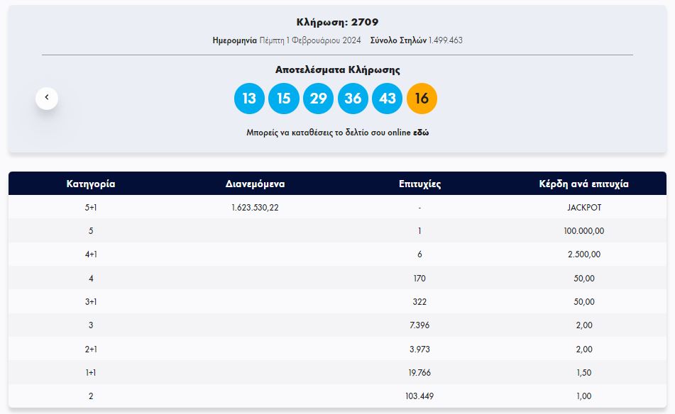 Στην κλήρωση ΤΖΟΚΕΡ, την Πέμπτη 1/2/2024 (αριθμός κλήρωσης 2709), οι τυχεροί αριθμοί ήταν οι εξής: