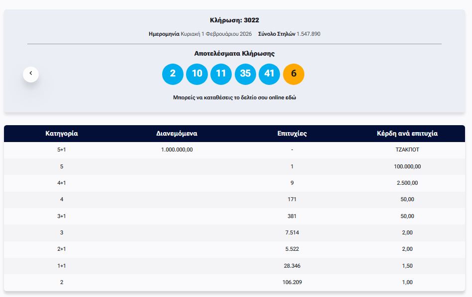 Έγινε το βράδυ της Κυριακής (01/02) η κλήρωση με αριθμό 3022 του ΤΖΟΚΕΡ.