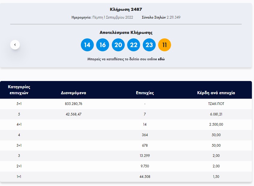 Στην κλήρωση ΤΖΟΚΕΡ, σήμερα Πέμπτη 1/9/2022 (αριθμός κλήρωσης 2487), οι τυχεροί αριθμοί ήταν οι εξής: