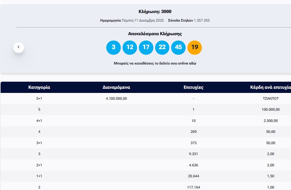 Οι τυχεροί αριθμοί είναι: 3, 12, 17, 22, 45 και ΤΖΟΚΕΡ ο αριθμός 19.