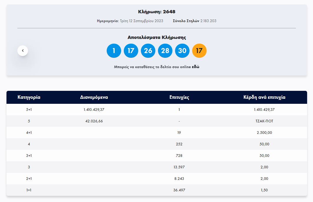 Στην κλήρωση ΤΖΟΚΕΡ, σήμερα Τρίτη 12/9/2023 (αριθμός κλήρωσης 2648), οι τυχεροί αριθμοί ήταν οι εξής: