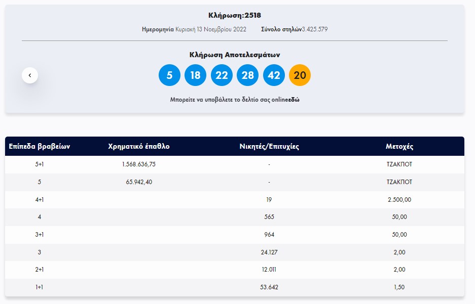 Στην κλήρωση ΤΖΟΚΕΡ, σήμερα Κυριακή 13/11/2022 (αριθμός κλήρωσης 2518), οι τυχεροί αριθμοί ήταν οι εξής: