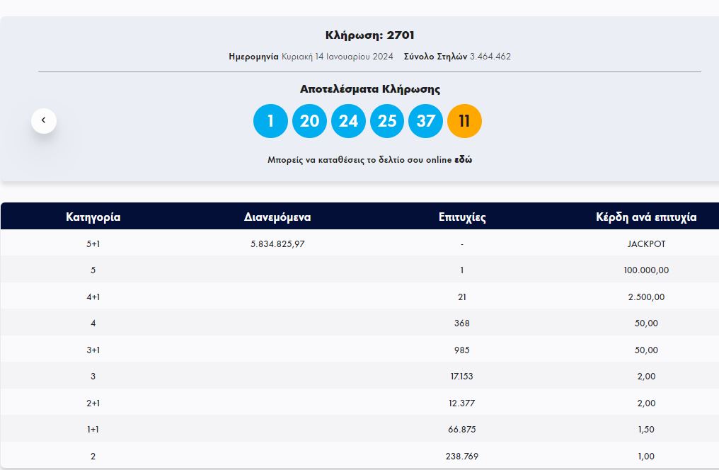 Στην κλήρωση ΤΖΟΚΕΡ, την Κυριακή 14/1/2024 (αριθμός κλήρωσης 2701), οι τυχεροί αριθμοί ήταν οι εξής: