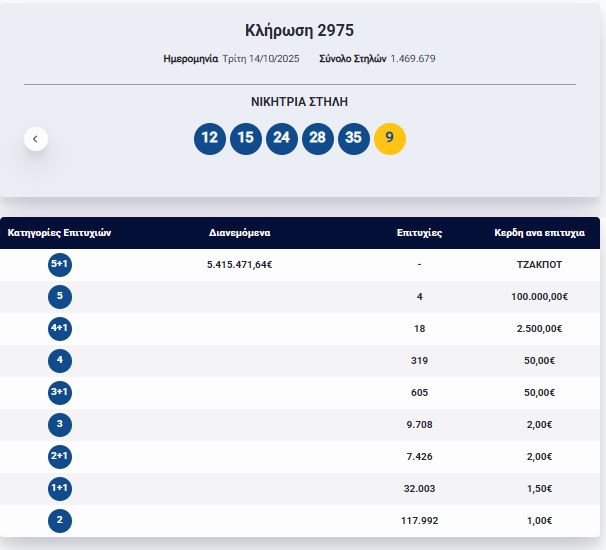 Έγινε η κλήρωση με αριθμό 2975 του ΤΖΟΚΕΡ το βράδυ της Τρίτης (14/10).