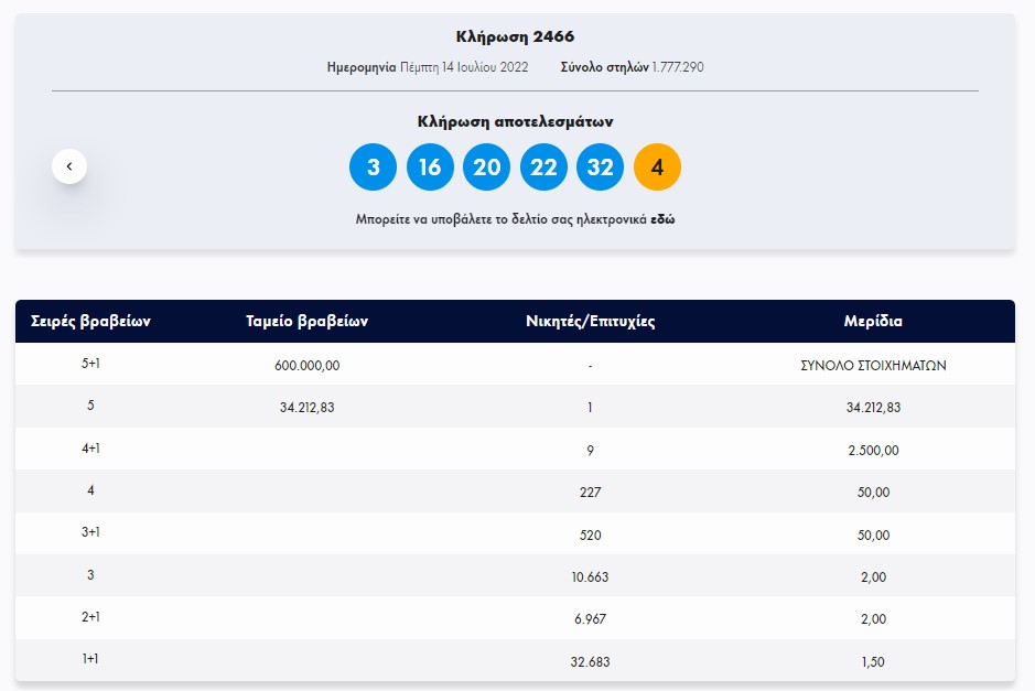 Στην κλήρωση ΤΖΟΚΕΡ, σήμερα Πέμπτη 14/7/2022 (αριθμός κλήρωσης 2466), οι τυχεροί αριθμοί ήταν οι εξής: