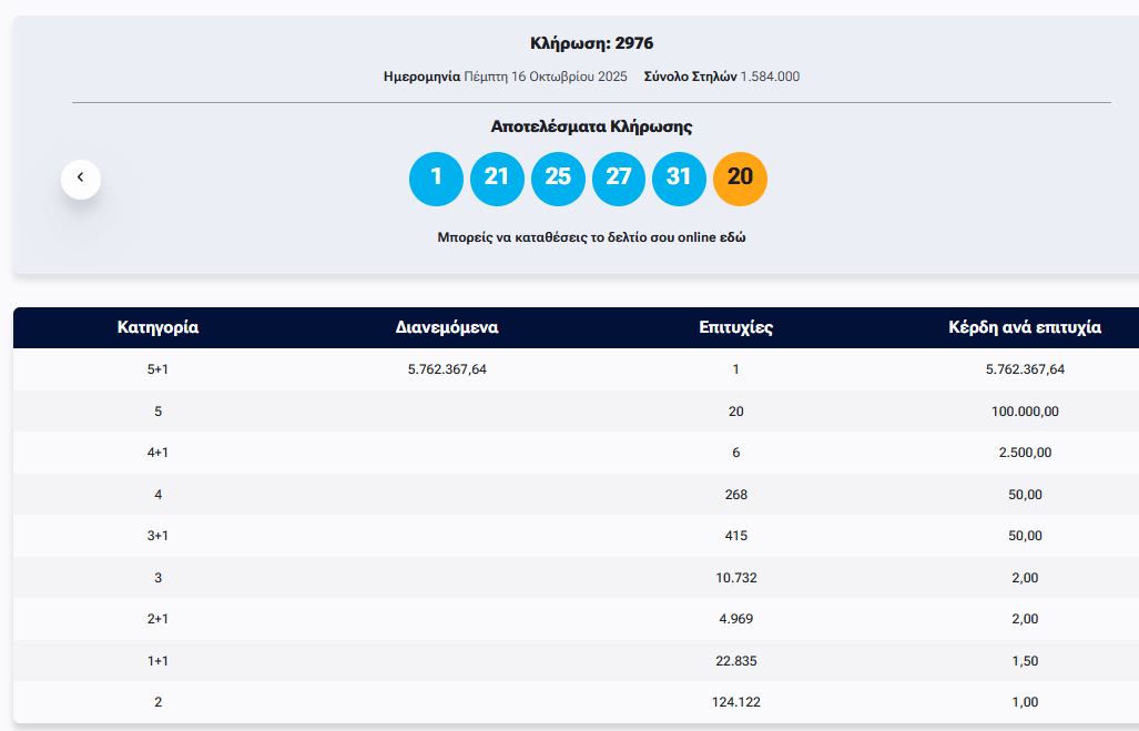 Οι τυχεροί αριθμοί είναι: 1, 21, 25, 27, 31 και ΤΖΟΚΕΡ ο αριθμός: 20.
