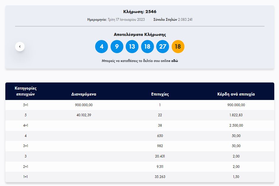 Το εν λόγω τυχερό παιχνίδι υπόσχεται τεράστια κέρδη που ενθουσιάζουν και για το λόγο αυτό αποτελεί το δημοφιλέστερο στην χώρα μας. Το παιχνίδι σας προσφέρει 8 τρόπους να κερδίσετε, ανάλογα με το πόσοι αριθμοί από αυτούς που κληρώθηκαν, συμφωνούν με τους 5+1 αριθμούς που επιλέξατε. Το ανανεωμένο δελτίο κάνει το παιχνίδι πιο εύκολο και ευχάριστο. Ο μοντέρνος σχεδιασμός και η μεγαλύτερη διάσταση σας επιτρέπουν να το συμπληρώνετε με μεγαλύτερη ευκολία. Επίσης, η νέα πίσω όψη του αποτελεί έναν σύντομο και χρήσιμο οδηγό παιξίματος.