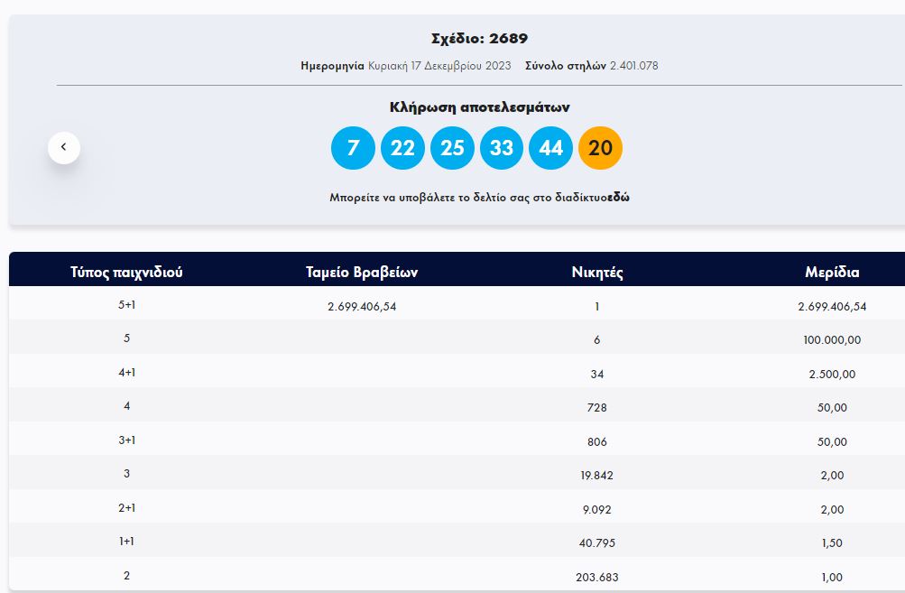 Στην κλήρωση ΤΖΟΚΕΡ, την Κυριακή 17/12/2023 (αριθμός κλήρωσης 2689), οι τυχεροί αριθμοί ήταν οι εξής: