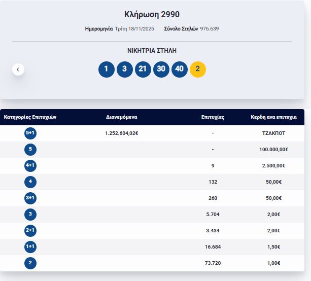 Οι τυχεροί αριθμοί είναι: 1, 3, 21, 30, 40 και ΤΖΟΚΕΡ ο αριθμός 2.