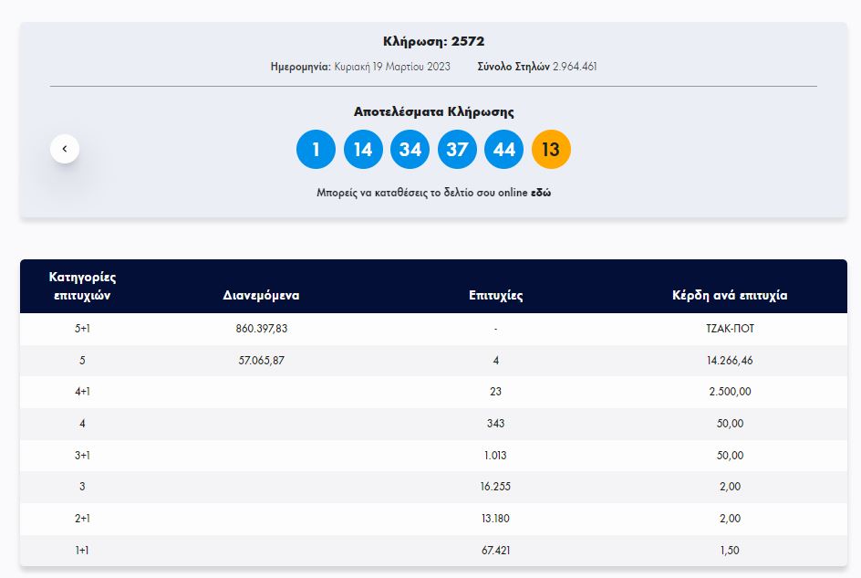 Στην κλήρωση ΤΖΟΚΕΡ, σήμερα Κυριακή 19/3/2023 (αριθμός κλήρωσης 2572), οι τυχεροί αριθμοί ήταν οι εξής: