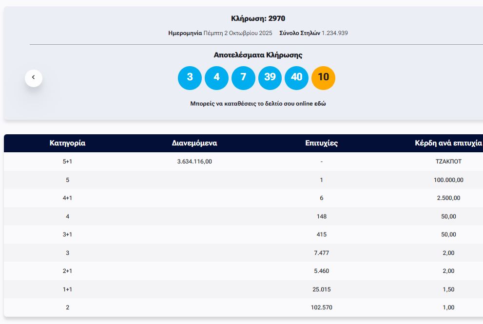 Οι τυχεροί αριθμοί είναι: 3, 4, 7, 39, 40 και ΤΖΟΚΕΡ ο αριθμός: 10.