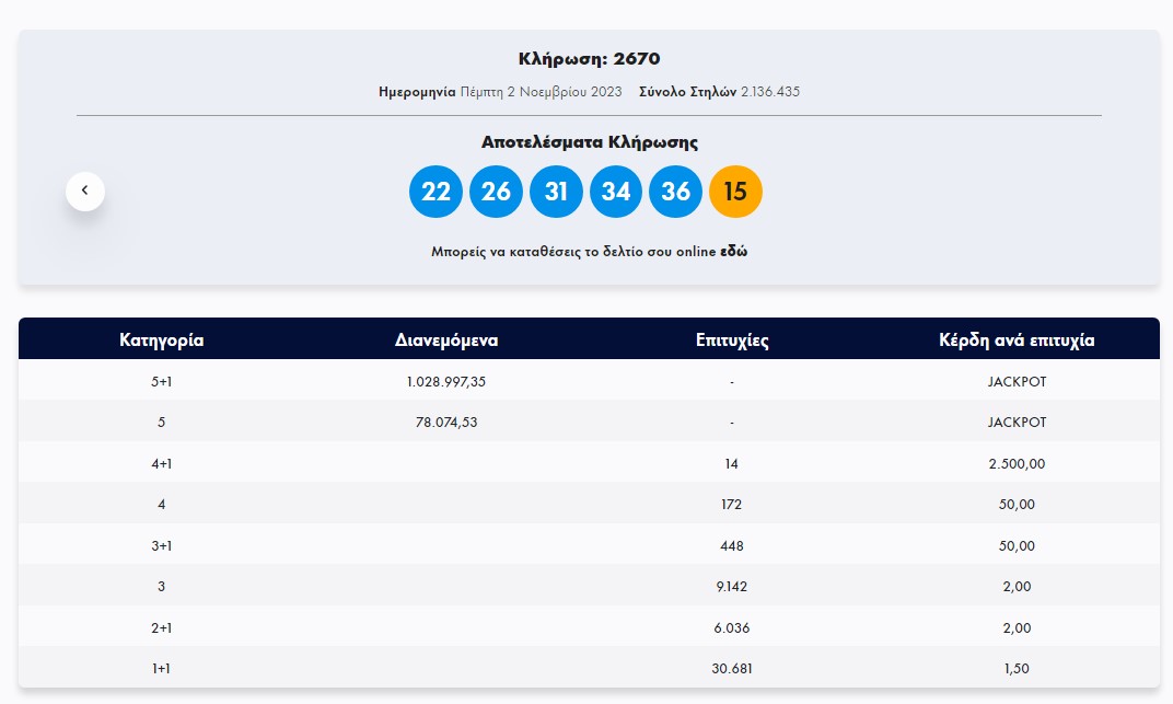 Στην κλήρωση ΤΖΟΚΕΡ, την Πέμπτη 2/11/2023 (αριθμός κλήρωσης 2670), οι τυχεροί αριθμοί ήταν οι εξής: