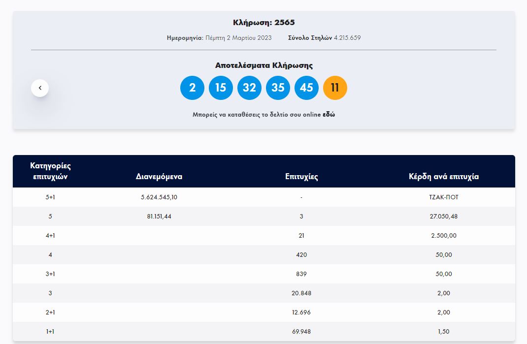 Στην κλήρωση ΤΖΟΚΕΡ, σήμερα Πέμπτη 2/3/2023 (αριθμός κλήρωσης 2565), οι τυχεροί αριθμοί ήταν οι εξής: