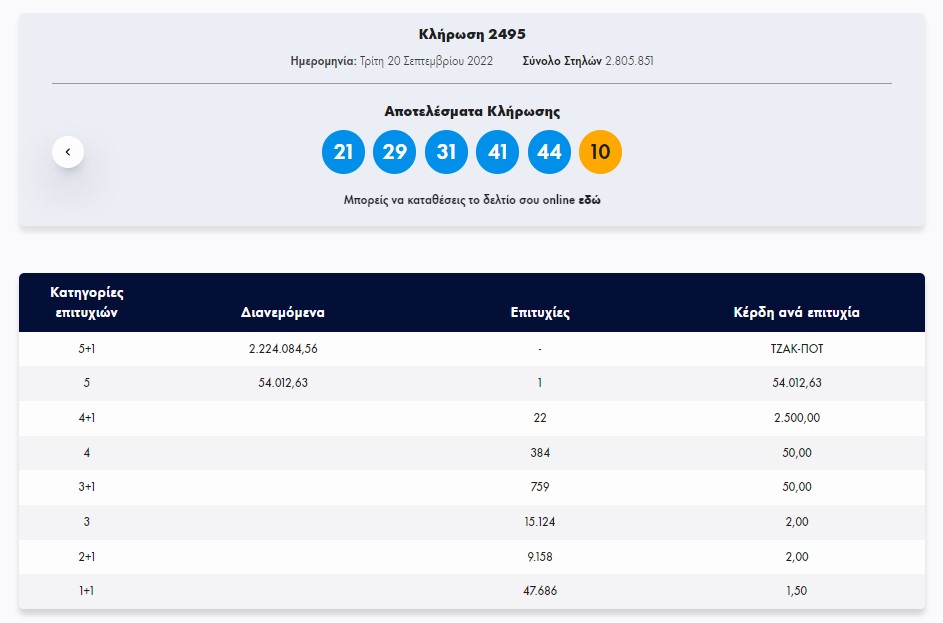 Στην κλήρωση ΤΖΟΚΕΡ, σήμερα Τρίτη 20/9/2022 (αριθμός κλήρωσης 2495), οι τυχεροί αριθμοί ήταν οι εξής: