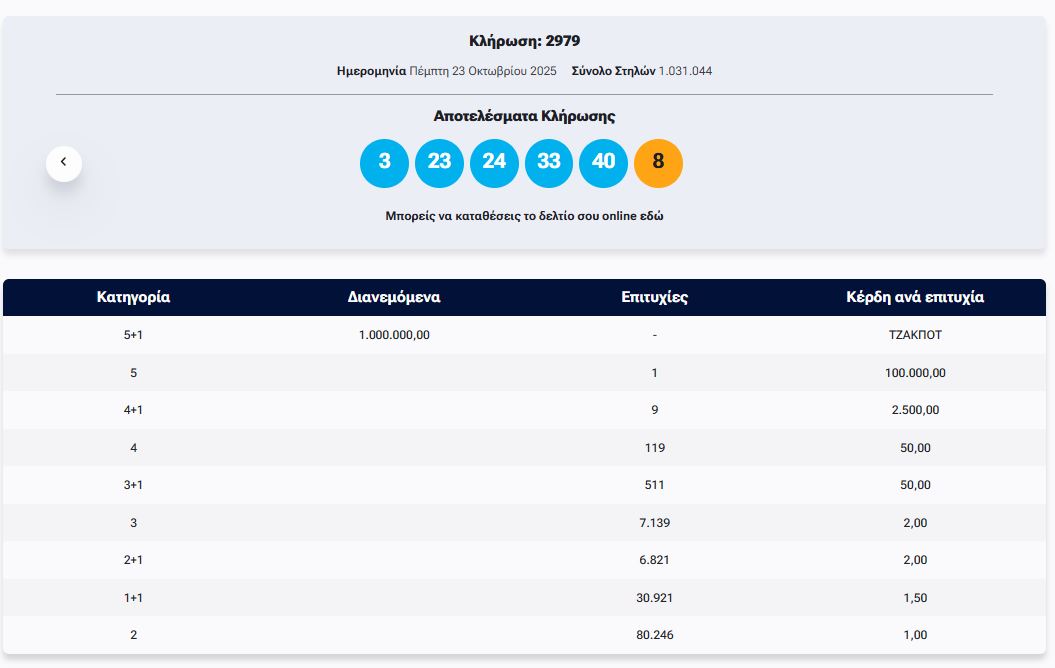 Οι τυχεροί αριθμοί είναι: 3, 23, 25, 33, 40 και ΤΖΟΚΕΡ ο αριθμός: 8.