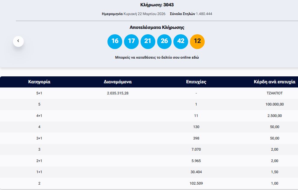 Οι τυχεροί αριθμοί είναι: 16, 17, 21, 26, 42 και ΤΖΟΚΕΡ ο αριθμός 12.