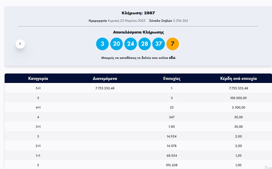 Κλήρωση ΤΖΟΚΕΡ 23/03/2025: Αυτοί είναι οι τυχεροί αριθμοί Δήμητρα Κόκκορη 22:08, Κυριακή 23 Μαρτίου 2025 κοινωνία Έγινε η κλήρωση με αριθμό 2887 του ΤΖΟΚΕΡ το βράδυ της Κυριακής (23/03). 18+ επίγειο, 21+ ψηφιακό |Αρμόδιος Ρυθμιστής ΕΕΕΠ | Κίνδυνος εθισμού & απώλειας περιουσίας | ΓΡΑΜΜΗ ΣΤΗΡΙΞΗΣ 1114 | Παίξε Υπεύθυνα. Η ΚΛΗΡΩΣΗ ΤΟΥ ΤΖΟΚΕΡ ΤΖΟΚΕΡ Μοιράσου το: σχολίασε κι εσύ (0 σχόλια) Ακολουθήστε το enikos.gr στο Google News και μάθετε πρώτοι όλες τις ειδήσεις Δείτε όλες τις τελευταίες ειδήσεις από την Ελλάδα και τον Κόσμο στο enikos.gr Ειδήσεις Ροή Ειδήσεων 10 ώρες πριν «Αδέλφια ζείτε»: Ράγισαν καρδιές στην Τούμπα για τους 7 οπαδούς του ΠΑΟΚ – Με δάκρυα, καπνογόνα και συνθήματα το συγκλονιστικό «αντίο» – ΦΩΤΟ και ΒΙΝΤΕΟ 8 ώρες πριν Τραγωδία στη «Βιολάντα»: Αδήλωτο από το 2007 το υπόγειο όπου έγινε η φονική έκρηξη – Τα νέα στοιχεία και τα αναπάντητα ερωτήματα 8 ώρες πριν Τραμπ: Απειλεί το Ιράν με στρατιωτικά πλήγματα αλλά τα αποτελέσματα είναι αβέβαια – Ορατός ο κίνδυνος ευρύτερου περιφερειακού πολέμου 11 ώρες πριν Εικόνες καταστροφής στην Αλεξανδρούπολη: «Έσπασαν» σιδηροδρομική γραμμή για να μην πλημμυρίσει οικισμός – «Έπεσαν μεγάλοι όγκοι νερού σε μικρό διάστημα» 11 ώρες πριν Δημοσκόπηση MRB: Στο 22,3% η ΝΔ, στη 2η θέση η Πλεύση Ελευθερίας με 10,1% – Τι λένε οι πολίτες για τη δήλωση Καρυστιανού για τις αμβλώσεις 56 λεπτά πριν Οπτική ψευδαίσθηση: Μόνο όσοι έχουν τέλεια όραση μπορούν να εντοπίσουν τη 2η γάτα μέσα σε 13 δευτερόλεπτα 1 ώρα πριν Άνοια: Η τροφή που συνδέεται με μειωμένο κίνδυνο και καλύτερη υγεία του εγκεφάλου 4 ώρες πριν Τα ζώδια σήμερα, Παρασκευή 30 Ιανουαρίου 2026: Καρκίνοι, ακούστε το ένστικτό σας και όχι τον φόβο σας 10 ώρες πριν Αριθμολογία: Οι 10 ημερομηνίες γέννησης που προσελκύουν δυνατούς έρωτες 49 λεπτά πριν Στο real taste & style που κυκλοφορεί με τη Realnews 11 λεπτά πριν Την Κυριακή με τη Realnews: Ό,τι και αν αγοράσεις, σκανάρεις και κερδίζεις! 26 λεπτά πριν MasterChef (29/1): Οι παίκτες που φόρεσαν λευκή ποδιά και μπήκαν στο σπίτι – Ποιος αποχώρησε 41 λεπτά πριν ΔΕΔΔΗΕ: Διακοπές ρεύματος σήμερα (30/1) στην Αθήνα και σε άλλες 13 περιοχές της Αττικής 56 λεπτά πριν Οπτική ψευδαίσθηση: Μόνο όσοι έχουν τέλεια όραση μπορούν να εντοπίσουν τη 2η γάτα μέσα σε 13 δευτερόλεπτα ENIKOS NETWORK Μόνο αν έχετε την όραση του Legolas θα βρείτε την πεταλούδα ανάμεσα στα παπαγαλάκια σε 11 δευτερόλεπτα; Οι θησαυροί του δάσους που μπορεί να ενισχύουν το ανοσοποιητικό, την καρδιά και το έντερο Μυτιληναίος: Προειδοποιεί για τις επιπτώσεις από την άνοδο του ευρώ ΑΑΔΕ: Σε λειτουργία η νέα ψηφιακή εφαρμογή για το Ευρωπαϊκό Σύστημα Απαλλαγής από τον ΦΠΑ – Ποιες επιχειρήσεις αφορά Google Search: Αναβαθμίζει τις δυνατότητες AI με Gemini 3 και Follow-up ερωτήσεις Κουίζ: Πόσο καλός είσαι στην ελληνική μυθολογία; Δοκίμασε τις γνώσεις σου και κάνε το 3 στα 3 περισσότερα 03:42 , Παρασκευή 30 Ιανουαρίου 2026 Δάφνη: Φωτιά σε μοτοσικλέτα κι όχημα έσβησε η Πυροσβεστική Φωτιά ξέσπασε τα ξημερώματα της Παρασκευής σε αυτοκίνητο και μοτοσικλέτα που ήταν σταθμευμένα ... 02:56 , Παρασκευή 30 Ιανουαρίου 2026 Κόρινθος: Σοβαρό τροχαίο στον Άσσο – Ι.Χ συγκρούστηκε με λεωφορείο – Δείτε βίντεο Σοβαρό τροχαίο ατύχημα, με υλικές ζημιές κι έναν τραυματία, σημειώθηκε το βράδυ της Πέμπτης (2... 00:52 , Παρασκευή 30 Ιανουαρίου 2026 Τραγωδία στα Ψαχνά Ευβοίας: Ηλικιωμένο ζευγάρι πέθανε από αναθυμιάσεις φωτιάς που ξεκίνησε από θερμαντικό σώμα Μια νέα τραγωδία σημειώθηκε το απόγευμα της Πέμπτης 29 Ιανουαρ
