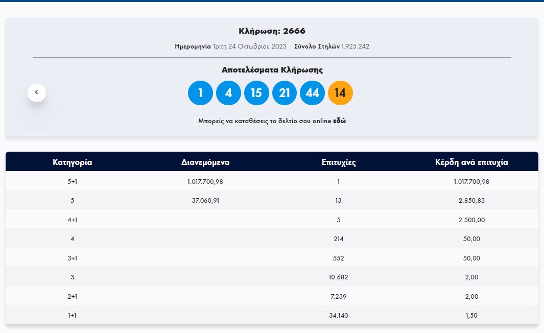 Στην κλήρωση ΤΖΟΚΕΡ, την Τρίτη 24/10/2023 (αριθμός κλήρωσης 2666), οι τυχεροί αριθμοί ήταν οι εξής: