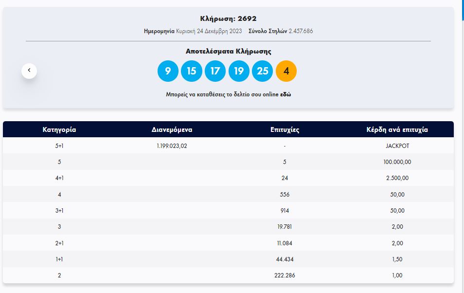 Στην κλήρωση ΤΖΟΚΕΡ, την Κυριακή 24/12/2023 (αριθμός κλήρωσης 2692), οι τυχεροί αριθμοί ήταν οι εξής:
