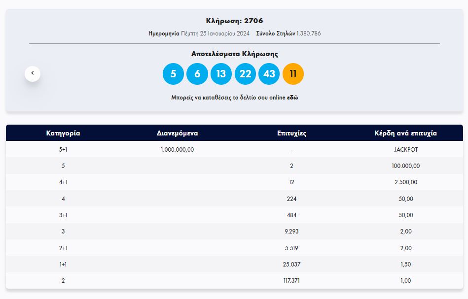 Στην κλήρωση ΤΖΟΚΕΡ, την Πέμπτη 25/1/2024 (αριθμός κλήρωσης 2706), οι τυχεροί αριθμοί ήταν οι εξής: