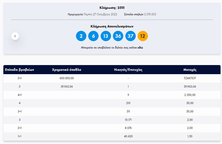 Στην κλήρωση ΤΖΟΚΕΡ, σήμερα Πέμπτη 27/10/2022 (αριθμός κλήρωσης 2511), οι τυχεροί αριθμοί ήταν οι εξής: