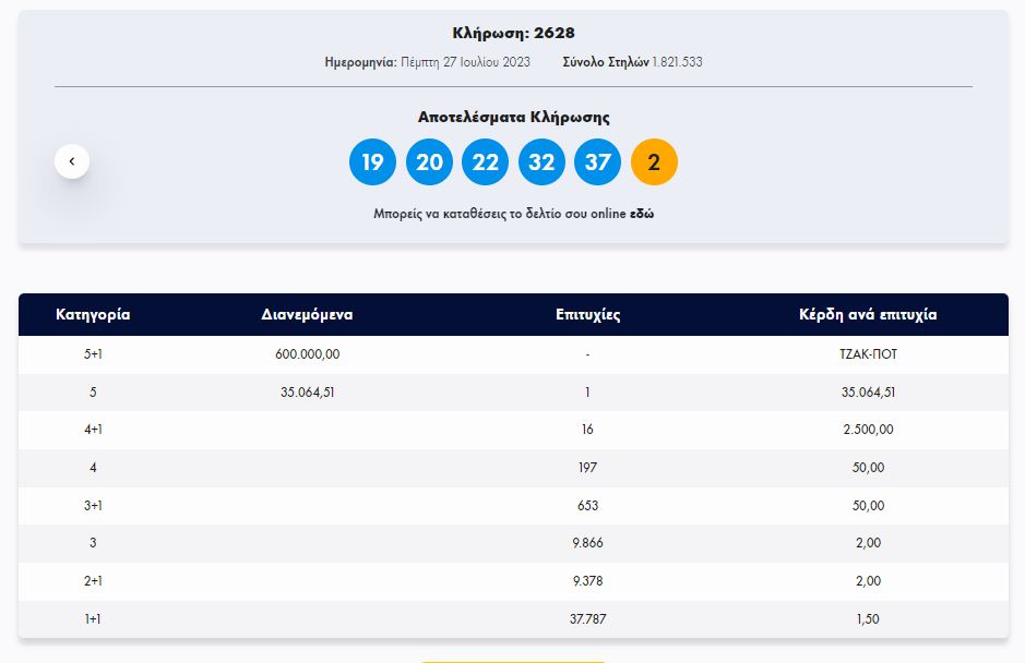 Στην κλήρωση ΤΖΟΚΕΡ, σήμερα Πέμπτη 27/7/2023 (αριθμός κλήρωσης 2628), οι τυχεροί αριθμοί ήταν οι εξής: