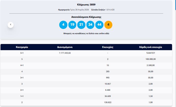 Έγινε το βράδυ της Τρίτης (28/4) η κλήρωση με αριθμό 3059 του ΤΖΟΚΕΡ.
