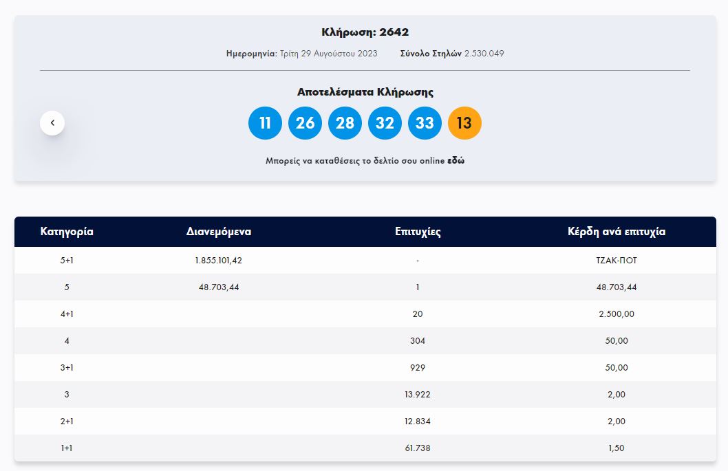 Στην κλήρωση ΤΖΟΚΕΡ, σήμερα Τρίτη 29/8/2023 (αριθμός κλήρωσης 2642), οι τυχεροί αριθμοί ήταν οι εξής: