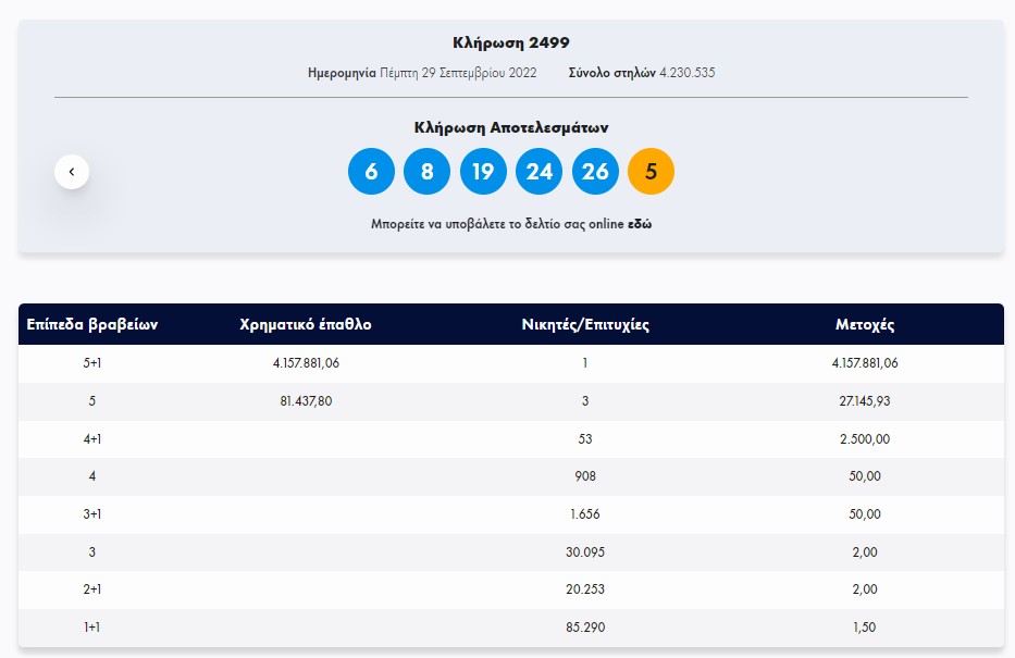 Στην κλήρωση ΤΖΟΚΕΡ, σήμερα Πέμπτη 29/9/2022 (αριθμός κλήρωσης 2499), οι τυχεροί αριθμοί ήταν οι εξής: