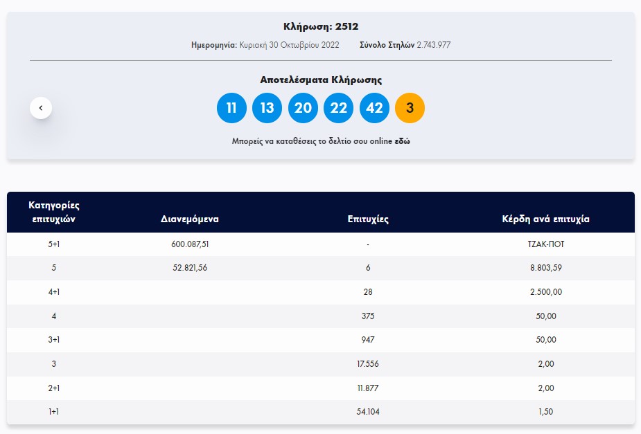 Στην κλήρωση ΤΖΟΚΕΡ, σήμερα Κυριακή 30/10/2022 (αριθμός κλήρωσης 2512), οι τυχεροί αριθμοί ήταν οι εξής: