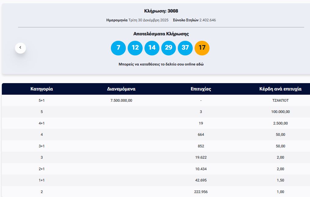 Κλήρωση ΤΖΟΚΕΡ 30/12/2025: Αυτοί είναι οι τυχεροί αριθμοί Enikos Newsroom 22:08, Τρίτη 30 Δεκεμβρίου 2025 κοινωνία Έγινε η κλήρωση με αριθμό 3008 του ΤΖΟΚΕΡ το βράδυ της Τρίτης (30/12). 18+ επίγειο, 21+ ψηφιακό | Αρμόδιος Ρυθμιστής ΕΕΕΠ | Κίνδυνος εθισμού & απώλειας περιουσίας | ΓΡΑΜΜΗ ΣΤΗΡΙΞΗΣ 1114 | Παίξε Υπεύθυνα. ΚΛΗΡΩΣΗ ΤΖΟΚΕΡ ΤΖΟΚΕΡ Μοιράσου το: Άρης: Υπέγραψε συμβόλαιο 2,5 ετών ο Μπουσαΐντ – «Το κίτρινο και το μαύρο είναι τα αγαπημένα μου χρώματα» CNN: H CIA χτύπησε την αποβάθρα στη Βενεζουέλα – Το πρώτο πλήγμα των ΗΠΑ στο εσωτερικό της χώρας Τροχαίο με έναν τραυματία στη Θεσσαλονίκη – Συγκρούστηκαν 3 οχήματα – Δείτε βίντεο σχολίασε κι εσύ (0 σχόλια) Ακολουθήστε το enikos.gr στο Google News και μάθετε πρώτοι όλες τις ειδήσεις Δείτε όλες τις τελευταίες ειδήσεις από την Ελλάδα και τον Κόσμο στο enikos.gr Ειδήσεις Ροή Ειδήσεων 2 ώρες πριν Καιρός: Πρωτοχρονιά στον… πάγο με τσουχτερό κρύο και θερμοκρασίες κάτω από το μηδέν – Πού αναμένεται να χιονίσει, νιφάδες και στην Αττική – Τι προβλέπουν οι μετεωρολόγοι 3 ώρες πριν Ρεβεγιόν στα μπλόκα για τους αγρότες: Βάζουν στην άκρη τα τρακτέρ για διευκόλυνση των εκδρομέων – Ξανακλείνουν τους δρόμους μετά την Πρωτοχρονιά 2 ώρες πριν Τι σημαίνει η ανάπτυξη των ρωσικών πυραύλων Oreshnik με πυρηνική ικανότητα στη Λευκορωσία – Η μάχη Κιέβου και Μόσχας να κερδίσουν την υποστήριξη του Τραμπ 5 ώρες πριν Γιάννης Τσουκαλάς: «Με το που είδαν το δικό τους άτομο να είναι κάτω στο ρινγκ έχασαν τον έλεγχο, θόλωσαν και μας επιτέθηκαν» 2 ώρες πριν ΗΠΑ: Γιατί εμφανίζονται ενοχλημένοι οι Αμερικανοί με τις πολιτικές του Ισραήλ στη Δυτική Όχθη – Το παρασκήνιο για το μέλλον του Νετανιάχου 3 ώρες πριν Συγκλονιστική ανακάλυψη στην Ιερουσαλήμ – Τελετουργικό λουτρό γεμάτο στάχτη μαρτυρά το τέλος μίας εποχής πριν από 2.000 χρόνια 4 ώρες πριν Ύπνος: Στριφογυρίζετε το βράδυ στο κρεβάτι; Ψυχίατρος εξηγεί γιατί αυτό αποτελεί απειλή για την ψυχική σας υγεία 5 ώρες πριν Αριθμολογία: Έρχονται σημαντικές αλλαγές τo 2026 για όσους έχουν γεννηθεί αυτές τις 11 ημερομηνίες 6 ώρες πριν Υφασμάτινα έπιπλα: Πώς να εξαφανίσετε τις δυσάρεστες οσμές με ένα υλικό από την κουζίνα σας 12 λεπτά πριν Στο real taste & style που κυκλοφορεί με τη Realnews 27 λεπτά πριν Κώστας Τσιάρας: Παραβατική συμπεριφορά το κλείσιμο των δρόμων – Πρέπει να έρθουν στον διάλογο οι αγρότες 42 λεπτά πριν Αμαλία Κωστοπούλου: Στο Κολοράντο μαζί με τον σύζυγό της Jake Medwell – Δείτε φωτογραφίες 57 λεπτά πριν Euroleague: Σπουδαία «διπλά» για Ζαλγκίρις και Μονακό – Τα αποτελέσματα και η βαθμολογία 1 ώρα πριν Στο real taste & style που κυκλοφορεί με τη Realnews ENIKOS NETWORK «Είμαι νευρολόγος – Γιατί δεν φοράω ποτέ ακουστικά όταν ξαπλώνω για ύπνο» – Κίνδυνος άνοιας Ρεκόρ απορρόφησης πόρων του Ταμείου Ανάκαμψης από το υπουργείο Υγείας Υπερταμείο: Ξεκινά η παραχώρηση της Εγνατίας Οδού για χρονικό διάστημα 35 ετών έναντι 1,275 δισ. ευρώ «Ημέρα Καριέρας» από τη ΔΥΠΑ: Περισσότερες από 1.000 θέσεις εργασίας από 40 επιχειρήσεις – Όλες οι λεπτομέρειες Ο Google Assistant θα παραμείνει λίγο περισσότερο για ορισμένους χρήστες Android Τεστ προσωπικότητας: Το βάζο που θα επιλέξετε αποκαλύπτει πώς λύνετε προβλήματα στη ζωή σας περισσότερα 23:45 , Τρίτη 30 Δεκεμβρίου 2025 Καιρός: Πρωτοχρονιά στον… πάγο με τσουχτερό κρύο και θερμοκρασίες κάτω από το μηδέν – Πού αναμένεται να χιονίσει, νιφάδες και στην Αττική – Τι προβλέπουν οι μετεωρολόγοι Με τσουχτερό κρύο και θερμοκρασίες κάτω από το μηδέν θα υποδε