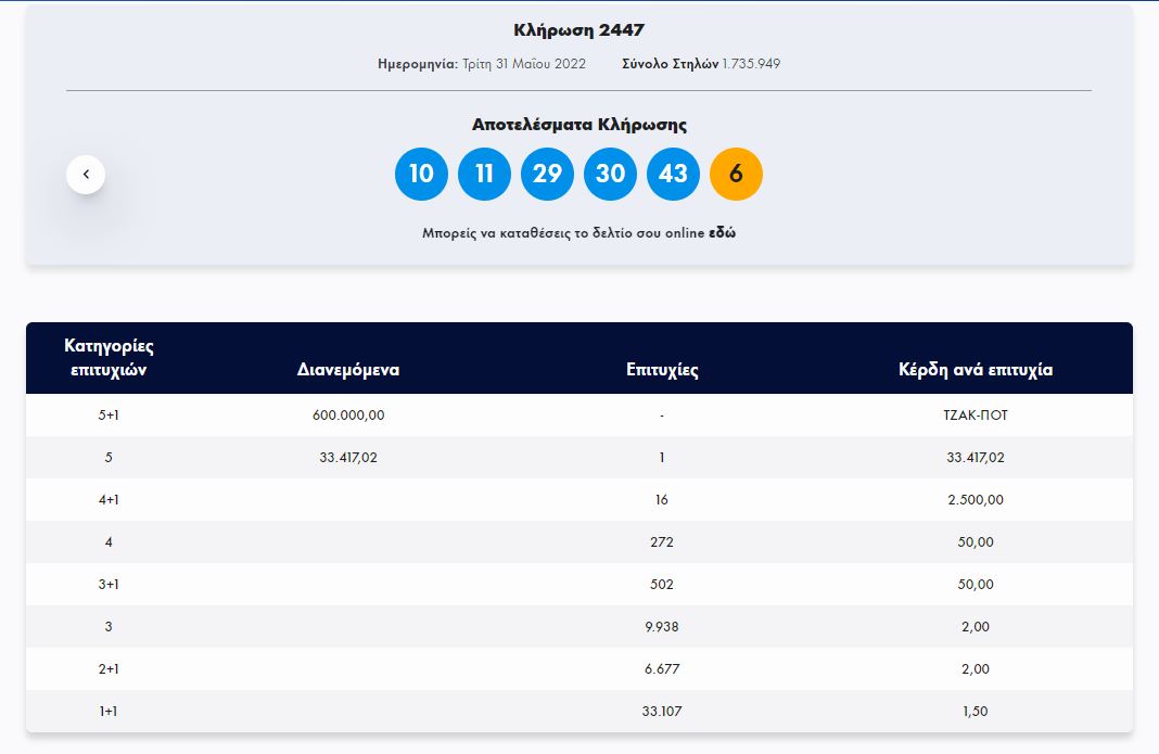 Το εν λόγω τυχερό παιχνίδι υπόσχεται τεράστια κέρδη που ενθουσιάζουν και για το λόγο αυτό αποτελεί το δημοφιλέστερο στην χώρα μας. Το παιχνίδι σας προσφέρει 8 τρόπους να κερδίσετε, ανάλογα με το πόσοι αριθμοί από αυτούς που κληρώθηκαν, συμφωνούν με τους 5+1 αριθμούς που επιλέξατε. Το ανανεωμένο δελτίο κάνει το παιχνίδι πιο εύκολο και ευχάριστο. Ο μοντέρνος σχεδιασμός και η μεγαλύτερη διάσταση σας επιτρέπουν να το συμπληρώνετε με μεγαλύτερη ευκολία. Επίσης, η νέα πίσω όψη του αποτελεί έναν σύντομο και χρήσιμο οδηγό παιξίματος.