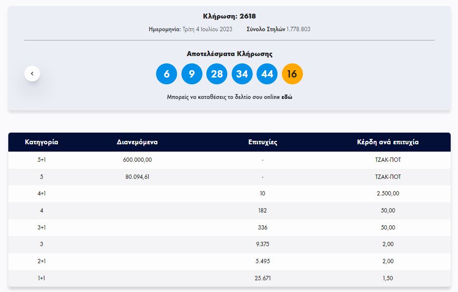 Το εν λόγω τυχερό παιχνίδι υπόσχεται τεράστια κέρδη που ενθουσιάζουν και για το λόγο αυτό αποτελεί το δημοφιλέστερο στην χώρα μας. Το παιχνίδι σας προσφέρει 8 τρόπους να κερδίσετε, ανάλογα με το πόσοι αριθμοί από αυτούς που κληρώθηκαν, συμφωνούν με τους 5+1 αριθμούς που επιλέξατε. Το ανανεωμένο δελτίο κάνει το παιχνίδι πιο εύκολο και ευχάριστο. Ο μοντέρνος σχεδιασμός και η μεγαλύτερη διάσταση σας επιτρέπουν να το συμπληρώνετε με μεγαλύτερη ευκολία. Επίσης, η νέα πίσω όψη του αποτελεί έναν σύντομο και χρήσιμο οδηγό παιξίματος.