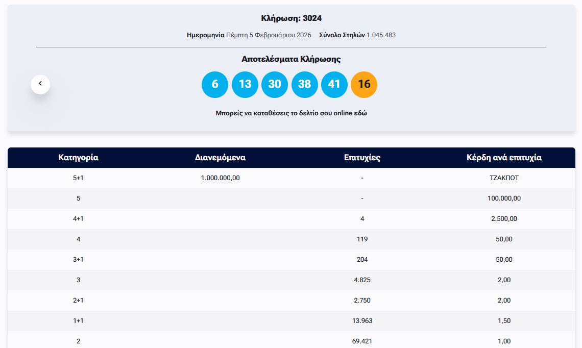 Έγινε το βράδυ της Πέμπτης (5/2) η κλήρωση με αριθμό 3024 του ΤΖΟΚΕΡ.