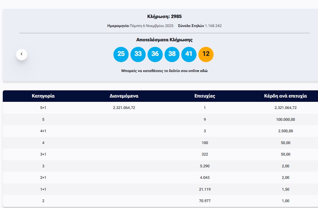 Έγινε η κλήρωση με αριθμό 2985 του ΤΖΟΚΕΡ το βράδυ της Πέμπτής (6/11).