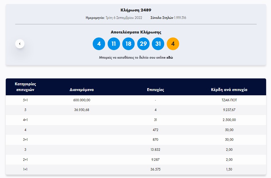 Στην κλήρωση ΤΖΟΚΕΡ, σήμερα Τρίτη 6/9/2022 (αριθμός κλήρωσης 2489), οι τυχεροί αριθμοί ήταν οι εξής: