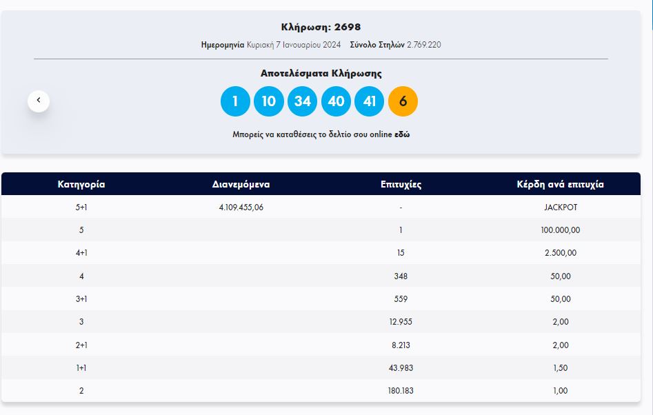 Στην κλήρωση ΤΖΟΚΕΡ, την Κυριακή 7/1/2024 (αριθμός κλήρωσης 2698), οι τυχεροί αριθμοί ήταν οι εξής: