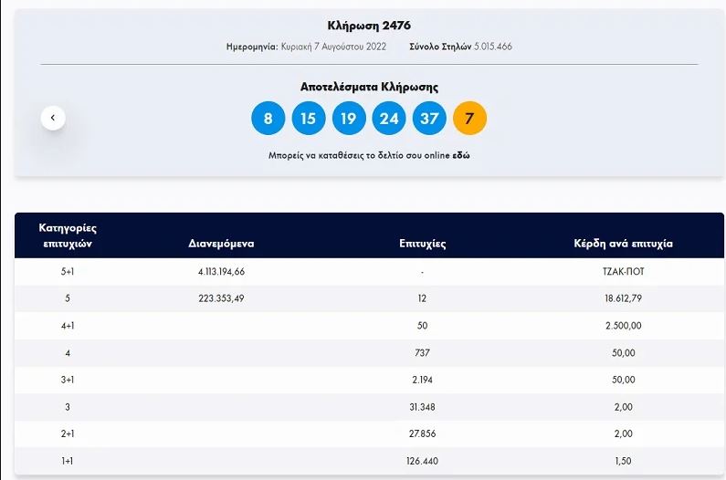 Στην κλήρωση ΤΖΟΚΕΡ, σήμερα Κυριακή 7/8/2022 (αριθμός κλήρωσης 2476), οι τυχεροί αριθμοί ήταν οι εξής: