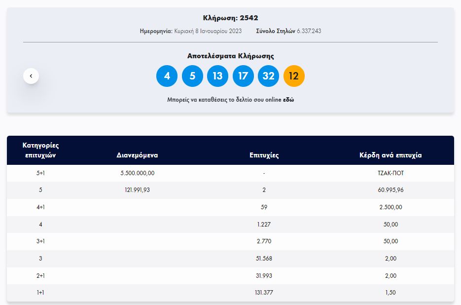 Το εν λόγω τυχερό παιχνίδι υπόσχεται τεράστια κέρδη που ενθουσιάζουν και για το λόγο αυτό αποτελεί το δημοφιλέστερο στην χώρα μας. Το παιχνίδι σας προσφέρει 8 τρόπους να κερδίσετε, ανάλογα με το πόσοι αριθμοί από αυτούς που κληρώθηκαν, συμφωνούν με τους 5+1 αριθμούς που επιλέξατε. Το ανανεωμένο δελτίο κάνει το παιχνίδι πιο εύκολο και ευχάριστο. Ο μοντέρνος σχεδιασμός και η μεγαλύτερη διάσταση σας επιτρέπουν να το συμπληρώνετε με μεγαλύτερη ευκολία. Επίσης, η νέα πίσω όψη του αποτελεί έναν σύντομο και χρήσιμο οδηγό παιξίματος.