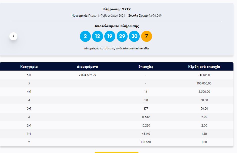 Στην κλήρωση ΤΖΟΚΕΡ, την Πέμπτη 8/2/2024 (αριθμός κλήρωσης 2712), οι τυχεροί αριθμοί ήταν οι εξής: