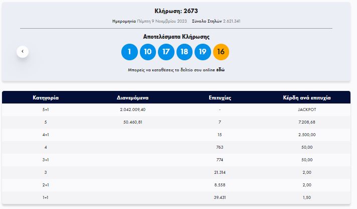 Στην κλήρωση ΤΖΟΚΕΡ, την Πέμπτη 9/11/2023 (αριθμός κλήρωσης 2673), οι τυχεροί αριθμοί ήταν οι εξής: