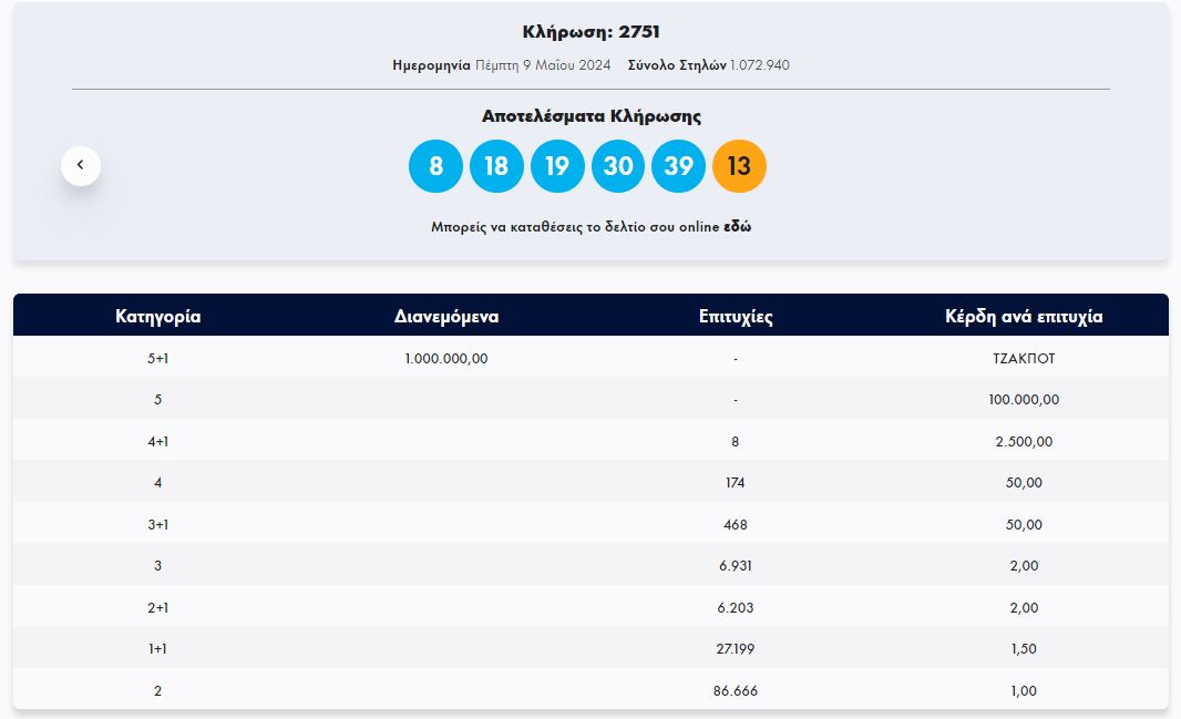 Στην κλήρωση ΤΖΟΚΕΡ, την Πέμπτη 9/5/2024 (αριθμός κλήρωσης 2751), οι τυχεροί αριθμοί ήταν οι εξής: