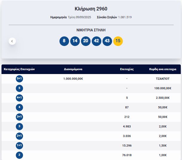 Έγινε η κλήρωση με αριθμό 2960 του ΤΖΟΚΕΡ το βράδυ της Τρίτης (9/9).