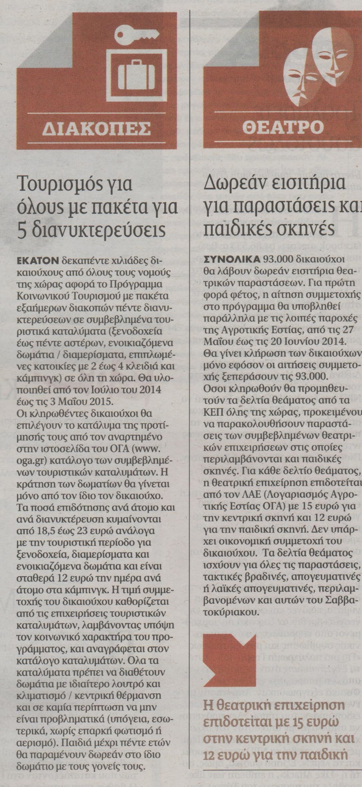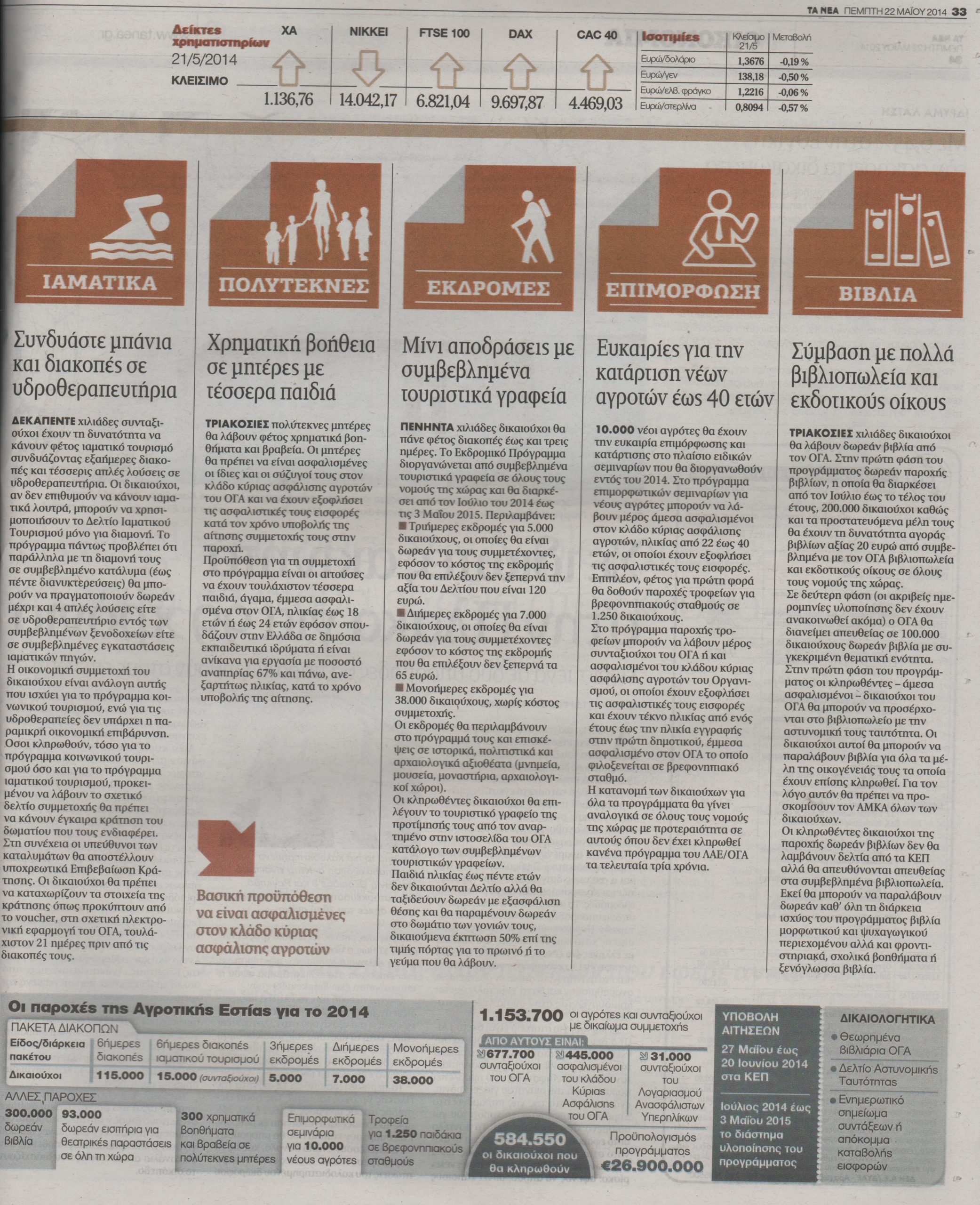 Ένας στους δύο αγρότες και συνταξιούχους του λογαριασμού ανασφάλιστων υπερηλίκων μπορεί να κάνει φέτος δωρεάν διακοπές και ιαματικό τουρισμό, να μετάσχει στο εκδρομικό πρόγραμμα ή να λάβει δωρεάν εισιτήρια για θεατρικές παραστάσεις και βιβλία.