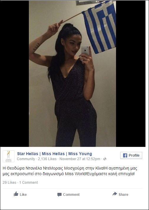 Μυστήριο πλανάται σχετικά από την αποβολή της ελληνικής συμμετοχής από τα καλλιστεία Μις Κόσμος, που γίνονται στην Κίνα. Σύμφωνα με την ιστοσελίδα Angelopedia, που παρακολουθεί όλα τα τεκταινόμενα των καλλιστείων, η Θεοδώρα Ντανιέλα ΝτεΜοραις Μοσχούρη αποβλήθηκε από τα καλλιστεία λόγω «ανάρμοστης συμπεριφοράς», χωρίς, όμως, να έχουν διευκρινιστεί οι ακριβείς λόγοι που έγινε κάτι τέτοιο.